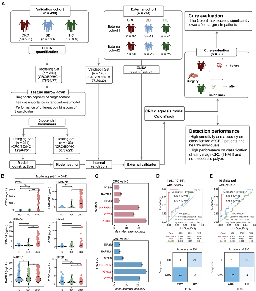 本研究提出了一个综合的工作流程,将基于分阶段质谱 (MS) 的发现和验证与基于 ELISA 的验证相结合,以识别 CRC 的 EV 蛋白生物标志物。应用于 1272 名受试者,构建了一个机器学习模型 ColonTrack,该模型整合了 EV 蛋白 HNRNPK、CTTN 和 PSMC6。ColonTrack 能够有效区分 CRC 和非 CRC 病例,并以较高的准确率识别早期 CRC(合并曲线下面积 [AUC] >0.97,灵敏度 ∼0.94,特异性 ∼0.93)。本亚军对组织和血浆中 EV 蛋白谱的分析表明,ColonTrack 有望成为一种用于 CRC 诊断和早期检测的强大的非侵入性生物标志物组合。