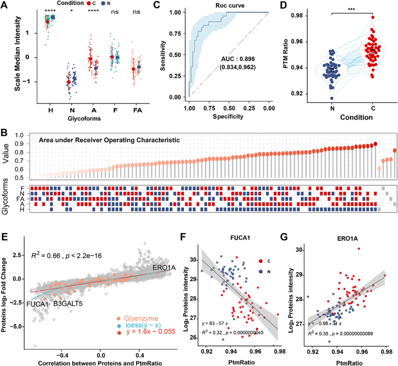 (A) 各糖型丰度按Wilcoxon秩和检验的P值缩放。(B) 糖型丰度中位数及其不同比例组合的受试者工作特征曲线 (ROC)。(C) 最佳组合的ROC曲线,以中位数H为分子,A与N之和为分母。(D) 最佳组合结果区分肿瘤(红点)和NAT(蓝点)。(E) 相关值与蛋白质差异丰度变化之间的相关性。 (F) 最佳组合结果与FUCA1丰度之间的相关性。 (G) 最佳组合结果与ERO1A丰度之间的相关性。