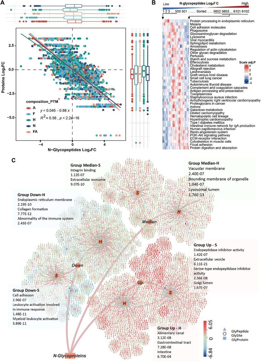 (A) 比较分析肿瘤和NAT中IGP及其对应蛋白的差异丰度变化。(B) 热图显示基于肿瘤和NAT中IGP丰度变化的KEGG通路富集糖蛋白。(C) CRC-糖蛋白-糖基-聚糖树。