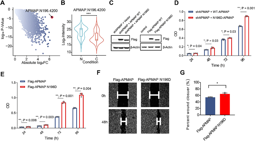 (A) 点图描绘了 CRC 中 IGP 与 NAT 相比的变化。(B) 箱线图比较了肿瘤和 NAT 之间 APMAP.N196.4200 IGP 的丰度。(C) HCT116 细胞中 APMAP 的挽救性表达。(D) HCT116 细胞中的细胞增殖情况。(E) CCK-8 检测评估异位过表达 WT APMAP 或 APMAP-N196D 突变体的 HCT116 细胞的增殖情况。(F) 伤口愈合实验的代表性图像显示,与 WT 相比,APMAP-N196D 突变体促进了细胞迁移。(G) 使用 ImageJ 软件量化伤口愈合实验中 HCT116 细胞的迁移水平。