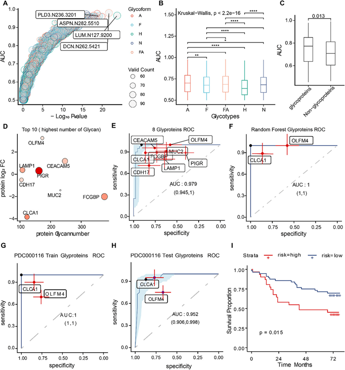 (A) 点图显示每种IGP的AUC值。(B) 箱线图显示每种糖型的AUC值。(C) 糖蛋白与非糖蛋白的AUC值比较。(D) IGP数量最多的前10种糖蛋白。颜色代表每种蛋白质所有位点的N-糖平均数量,饱和度越高代表平均值越高。(E) ROC曲线显示多种糖蛋白逻辑回归模块在CRC识别中的表现。(F) ROC曲线显示使用CLCA1和OLFM4组合构建随机森林模型的结果。(G) ROC 曲线展示了使用公开数据对 CLCA1 和 OLFM4 随机森林模型进行训练的结果。(H) ROC 曲线展示了使用公开数据对 CLCA1 和 OLFM4 随机森林模型进行测试的结果。(I) 免疫组化 (IHC) 患者的多因素生存分析采用 Cox 回归分析。