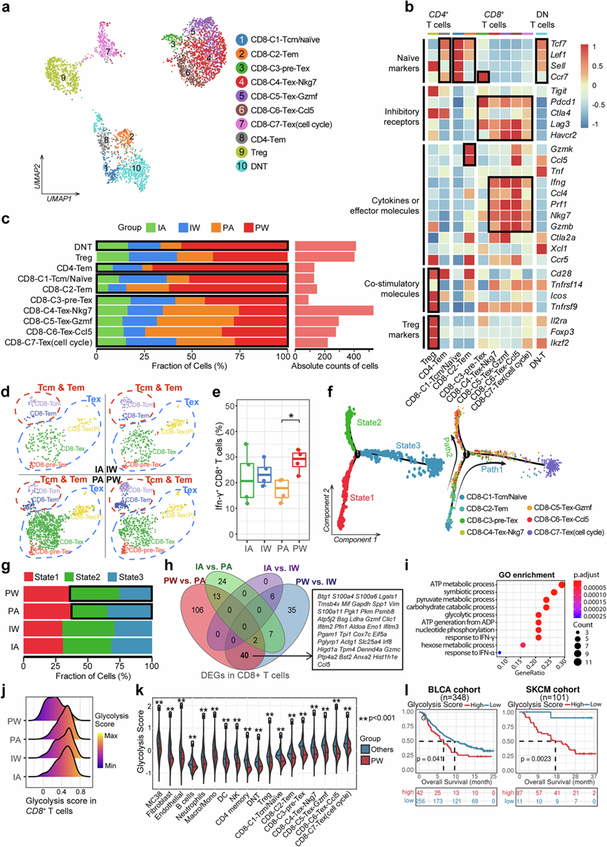(a) UMAP可视化描绘了四组中 T 细胞的聚类和亚型。(b) 热图说明了与 T 细胞亚型和功能相关的特征基因的表达模式。(c) 条形图显示了四组中 T 细胞亚型的比例分布。(d) UMAP图揭示了四组中CD8+ Tcm 和CD8+ Tex 细胞的分布和比例。(e) 箱线图表示基于流式细胞的四个治疗组中 IFN-γ+ T 细胞的比例。(f) 轨迹图揭示了CD8+ T 细胞的进化路径和不同状态。(g) 条形图表示四组中每种状态下CD8+ T 细胞的比例。(h) 维恩图显示了来自四组的CD8+ T 细胞的交叉差异表达基因 (DEG)。(i) 气泡图显示了 40 个 DEG 中显著富集的功能通路。(j) 脊图描绘了四组中CD8+ T 细胞的糖酵解水平。(k) 小提琴图比较了 PW 组细胞与其他组细胞的糖酵解水平。(l) Kaplan -Meier 生存曲线显示了两个免疫治疗组中细胞糖酵解水平与治疗结果之间的关系。