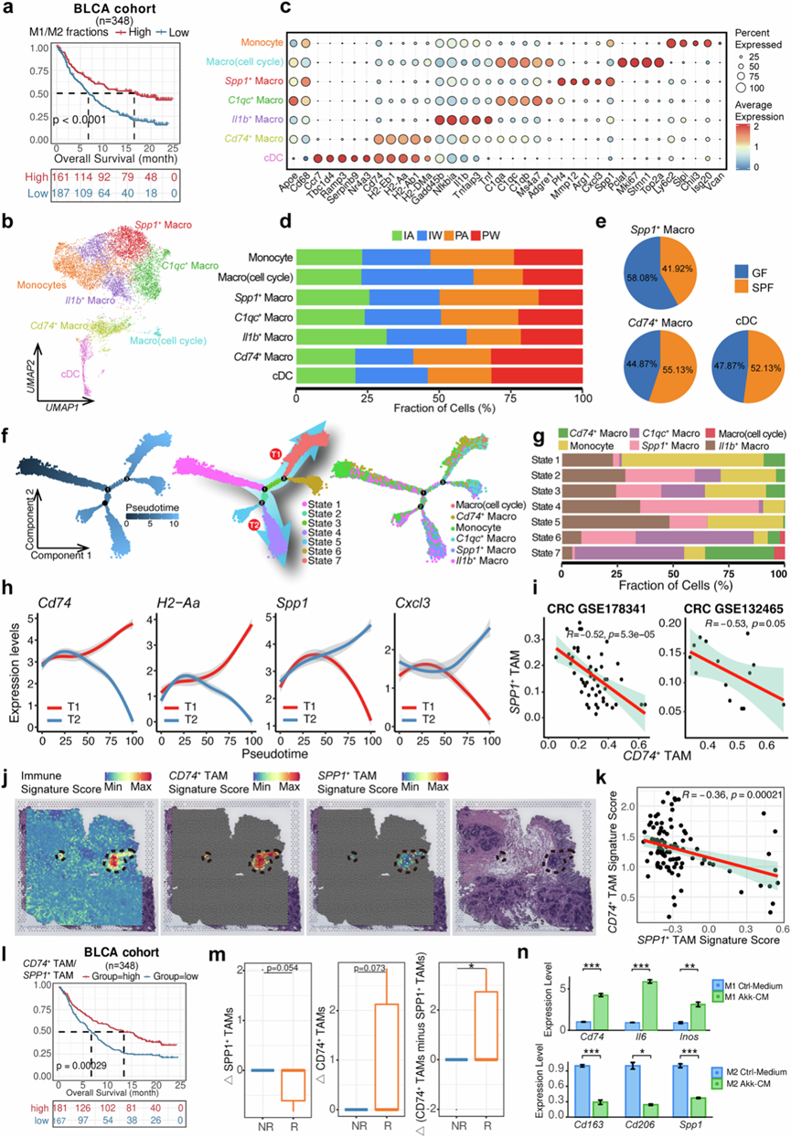(a) Kaplan-Meier 生存曲线显示 M1/M2 比例与膀胱癌 (BLCA) 队列中免疫疗法治疗结果的相关性。(b) UMAP分析描绘了髓系细胞的聚集和亚型。(c) 气泡图揭示了不同髓系细胞亚型中标记基因的表达谱。(d) 条形图显示了四组中髓系亚型的比例分布。(e) 饼图显示了基于 GSE181745 数据集的常菌小鼠及其无菌小鼠中Spp1+肿瘤相关巨噬细胞 (TAM)、Cd74 + TAM 和 cDC的比例。(f) 轨迹图揭示了巨噬细胞/单核细胞的进化路径和不同状态。(g) 条形图显示了7 种进化状态下单核细胞/巨噬细胞亚型的比例。(h) 折线图显示了抗原呈递基因(即Cd74和H2-Aa)和 M2 相关基因(即Spp1和Cxcl3)随伪时间变化的 loess 回归平滑表达。(i) 散点图显示了两个 CRC 队列中SPP1 + TAM 和CD74 + TAM比例与公开 scRNA-seq 数据的相关性。(j) 代表性空间特征图显示了 CRC 患者样本肿瘤切片中免疫细胞、CD74+ TAM 和SPP1+ TAM的特征得分。(k) 散点图揭示了中 CRC 肿瘤样本中免疫细胞富集区域中CD74+ TAM 和SPP1+ TAM 的特征评分之间的相关性。(l) Kaplan-Meier 生存曲线显示肿瘤浸润CD74+TAM/ SPP1+ TAM 比例与两个免疫治疗队列中 ICI 治疗结果的相关性。(m) 箱线图显示 FMT 队列治疗前后特定 TAM 亚型比例的变化。(n) M1 和 M2 巨噬细胞中巨噬细胞相关基因的表达水平。