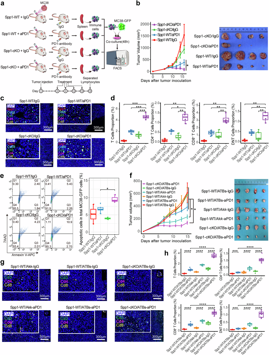 (a) 与Spp1 -WT 小鼠相比,Spp1 -cKO 小鼠的 ICI/IgG 治疗实验设计示意图。(b) 折线图(左)描述了中所示研究中四组小鼠皮下肿瘤的体积进展。进行了两批实验,每组四只小鼠。图像(右)显示了一个批次的四组切除肿瘤的比较。(c) 多重免疫荧光(mIF)图像显示了四组皮下肿瘤内 T 细胞和Spp1+巨噬细胞的染色。(d) 条形图量化了四组小鼠皮下肿瘤内基于 mIF 的 T 细胞亚型比例。(e) 配对细胞流式细胞面板(左)和箱线图(右)展示了 4 个组中与脾脏来源的 T 细胞共培养的 MC38 细胞凋亡百分比。(f) 折线图(左)展示了Spp1 -cKO 小鼠与Spp1 -WT小鼠相比,6 个 ATB 治疗小鼠组中皮下肿瘤体积的进展情况。图像(右)显示了 6 个组中切除的肿瘤的比较。(g) mIF图像表示揭示了 6 个组中皮下肿瘤内 T 细胞的空间分布。(h) 条形图显示了六组小鼠皮下肿瘤中 T 细胞亚型的比例。
