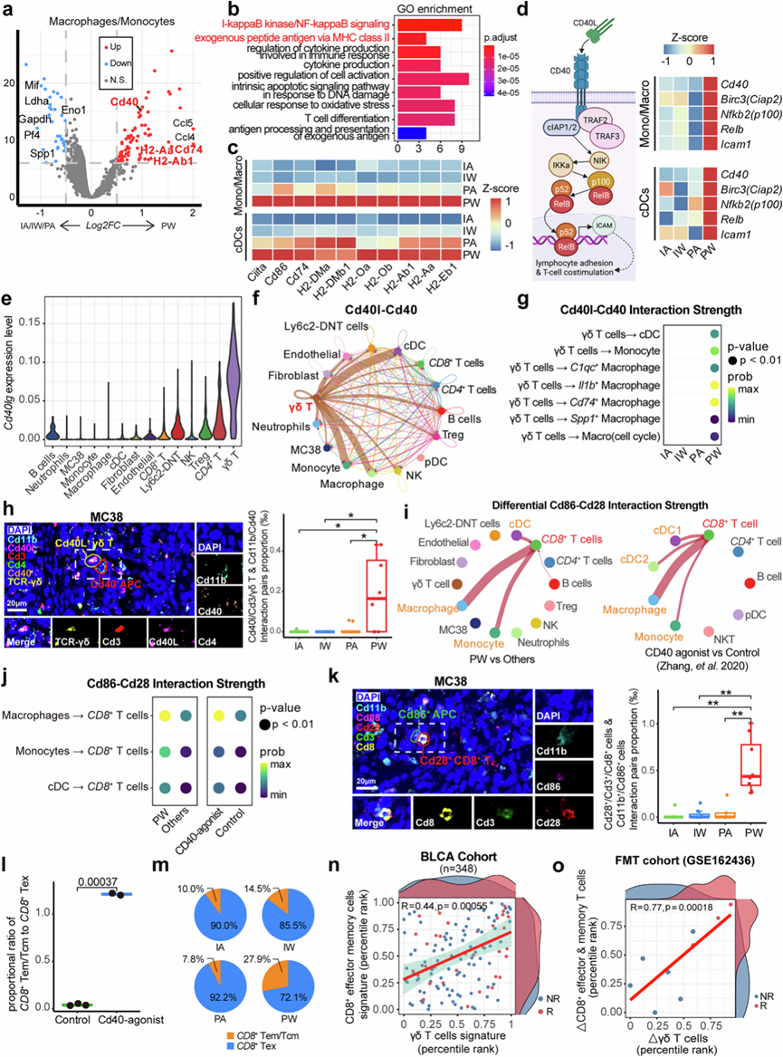 (a) 火山图描绘了 PW 组皮下肿瘤巨噬细胞和单核细胞与其他组相比的差异表达基因(DEG)。(b) DEG 的通路富集分析。(c) 热图显示了四组中抗原呈递传统树突状细胞 (cDC) 和单核细胞/巨噬细胞中 MHC-II 相关基因的表达水平。(d) 示意图(左)描述了非经典 NFκB 通路中的关键基因,该通路在四组小鼠的热图(右)中显示了在 cDC 和单核细胞/巨噬细胞中的表达。(e) 小提琴图揭示了所有细胞类型中Cd40lg的MAGIC表达水平。(f) 网络图描绘了 Cd40l-Cd40 通路中不同细胞类型之间的细胞相互作用强度。(g) 气泡图表示四组中 γδ T 细胞与 cDC、单核细胞和巨噬细胞亚群之间的 Cd40l-Cd40 通路相互作用强度。(h) 代表性多重免疫荧光 (mIF) 图像(左)说明了皮下肿瘤内相互作用的 Cd40l + γδ T 细胞和 Cd40 + APC 的空间分布,箱线图(右)显示了四组中皮下肿瘤内相互作用的 Cd40l + γδ T 细胞和 Cd40 + APC 对的数量。(i) 左侧的网络图显示了 PW 组中肿瘤浸润 CD8+ T 细胞与其他细胞类型之间的 Cd86-Cd28 通路相互作用强度与其他三组相比的差异;右侧的网络图显示了接受 Cd40 激动剂治疗的小鼠与对照小鼠相比,肿瘤浸润性CD8 + T 细胞之间 Cd86-Cd28 通路的相互作用强度差异。(j) 气泡图显示了(i)中肿瘤浸润性巨噬细胞/单核细胞/cDC 与CD8+ T 细胞之间 Cd86-Cd28 通路的相互作用强度。(k) 代表性mIF图像(左)说明了相互作用的 Cd86+ APC 和 Cd28 + Cd8+的空间分布皮下肿瘤内的 T 细胞,箱线图(右)显示四组皮下肿瘤内相互作用的 Cd86+ APC 和Cd28+ Cd8+ T 细胞对的数量。(l) 箱线图比较了Cd40 激动剂治疗小鼠和对照组之间肿瘤浸润CD8+效应记忆/中央记忆 T 细胞与CD8+耗竭 T 细胞的比例。(m) 饼图显示四组中 CD8+效应记忆/中央记忆 T 细胞与 CD8+耗竭 T 细胞的比例。(n) 边际密度散点图显示BLCA免疫治疗队列患者肿瘤浸润CD8 +效应记忆和 γδ T 细胞的比例。(o) 散点图显示FMT 前后γδ T 细胞丰度与CD8+效应和记忆 T 细胞丰度变化之间的线性相关性。