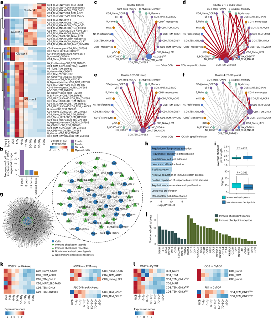(a) 热图显示 CCI 在整个生命周期中存在显著差异。(b) 条形图显示 T 细胞随着年龄的增长在 CCI 中经历最密集的重塑。(c-f) CCI聚类的网络分析。(g) 网络图显示由差异表达的配体和受体介导的 CCI 网络。(h) GO分析。(i) 箱线图显示免疫检查点和非免疫检查点的平均最短路径长度和程度。(j) 条形图显示每个免疫检查点配体和受体在哪些细胞亚群中检测到差异表达。(k) 热图显示通过 scRNA-seq 检测到的所示细胞亚群中CD27、ICOS和PDCD1基因在整个生命周期内的表达。(l) 热图显示了通过 CyTOF 检测到的所示细胞亚群中 CD27、ICOS 和 PD1 蛋白在整个生命周期内的表达。