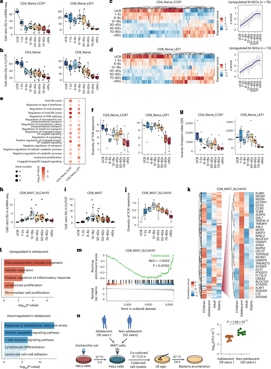 (a-b) CD4 +(CD4_Naive_CCR7;左)和 CD8 +幼稚 T 细胞(CD8_Naive_LEF1;右)在总 αβ T 细胞中的比例随着年龄的增长而变化。(c-d) 热图显示八个生命阶段中 CD4_Naive_CCR7和 CD8_Naive_LEF1细胞中 M-DEG 的行尺度表达(左),线图显示随年龄上调的 M-DEG 的表达轨迹(右)。(e) 点图显示 CD4 +和 CD8 +幼稚 T 细胞中随年龄上调的 M-DEG 的代表性富集生物学过程。(f-g) TCR 库多样性,以 Shannon 熵和逆辛普森指数衡量。(h-j) CD8_MAIT_SLC4A10 细胞在总 αβ T 细胞中随年龄变化的比例变化,及其以 Shannon 熵衡量的八个生命阶段的 TCR 库多样性。(k) 热图显示青少年(12-18 岁)中 CD8_MAIT_SLC4A10 细胞中所有 DEG 的表达(左)和上调基因的放大(右)。(l)通路分析。(m) GSEA 富集图。(n) MAIT 细胞杀菌能力测定设计的示意图。