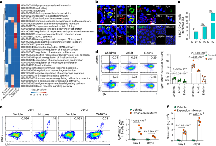 (a) 热图显示基于 scRNA-seq 分析的每个 B 细胞亚群中特征基因的功能富集分析。(b)免疫荧光分析。(c) 条形图显示来自三名纵向随访婴儿的 PBMC中 B_BCR+ GNLY +细胞的百分比。(d-e) 流式细胞分析。(f) 条形图显示在有或没有扩增混合物的体外刺激后培养第 1 天和第3 天的 B 细胞培养上清液中的 GNLY 浓度。