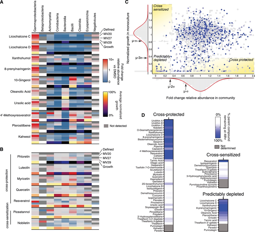 本项研究绘制了约 150 种小分子膳食异生物质与肠道微生物之间的相互作用,包括这些化合物对群落组成的影响、人类肠道微生物对膳食异生物质的代谢活动以及这些特征的个体间差异。微生物代谢可以毒化和解毒这些化合物,产生新兴的相互作用,解释膳食异生物质对群落特定重塑的影响。本项研究确定了负责解毒一种膳食异生物质白藜芦醇的基因和酶,并证明这种酶有助于白藜芦醇对群落重塑的个体间差异。总之,这些结果系统地绘制了膳食异生物质与肠道微生物之间的相互作用,并将毒化和解毒与微生物群对饮食反应的个体差异联系起来。