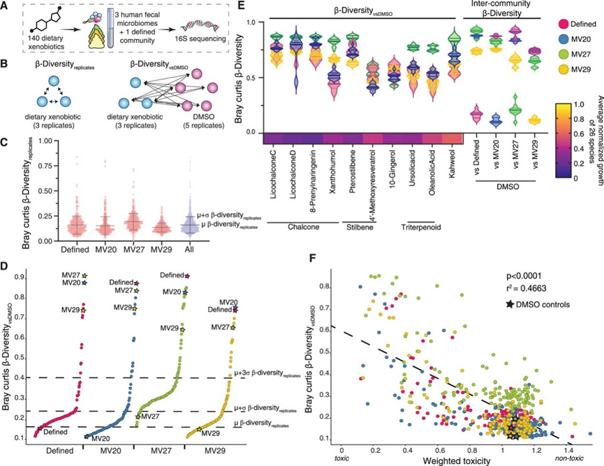 使用 16S rRNA测序测量的群落组成,他们评估了样本之间的 β 多样性(图 2 B)。用相同化合物处理的同一群落的独立重复表现出较低的 β 多样性(图 2 C)。为了定量膳食异生物质对群落组成的影响,他们检测了生长的群落与 DMSO 对照之间的 β 多样性。MV27 的整体 β 多样性得分高于其他群落(图 2 D),表明它更容易受到破坏;该群落还表现出低 α 多样性(Shannon 熵)和更高的梭菌相对丰度。他们确定了显著重塑群落的化合物(图 2 D)。总共有 25/140 种化合物(19%)导致至少一个群落发生显著重塑(图 2 D),其中 10 种化合物破坏了所有四个群落(“泛破坏性化合物”)(图 2 E)。这些泛破坏性化合物引起的变化与来自不同捐赠者的群落之间的差异(群落间 β 多样性)相当(图 2 E),表明这种重塑程度与微生物组功能有关。与 DMSO 对照相比,存在泛破坏性化合物的情况下这些群落的最终密度(OD 600)也降低了,表明绝对细菌丰度降低了。值得注意的是,泛破坏性化合物在纯培养中也对肠道共生体有毒性(图 2 E)。事实上,当考虑所有化合物时,纯培养中对单个物种的平均毒性与 β-多样性与 DMSO显著相关,表明化合物毒性是这些条件下群落重塑的主要预测因素(图 2 F)。