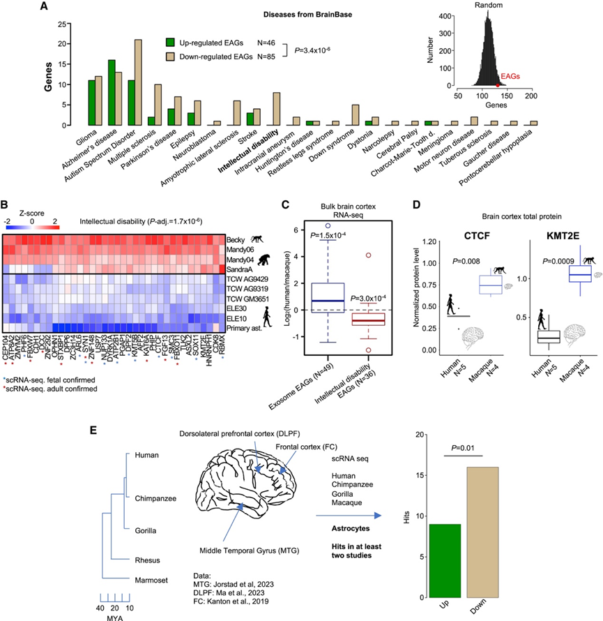 (A) 下调的 EAG 比激活的 EAG 与脑部疾病的关联性更高。(B) iAstrocyte 和胎儿星形胶质细胞中与 ID 相关的下调 EAG 的表达热图。(C) 与猕猴大脑皮层相比,外泌体相关基因在人类中表现出普遍的转录上调。(D) 与猕猴大脑皮层组织相比,人类 ID 相关基因 CTCF 和 KMT2E(分别为左和右)的蛋白质水平降低。(E) 在人类成人星形胶质细胞中,ID 相关基因下调的频率高于上调。