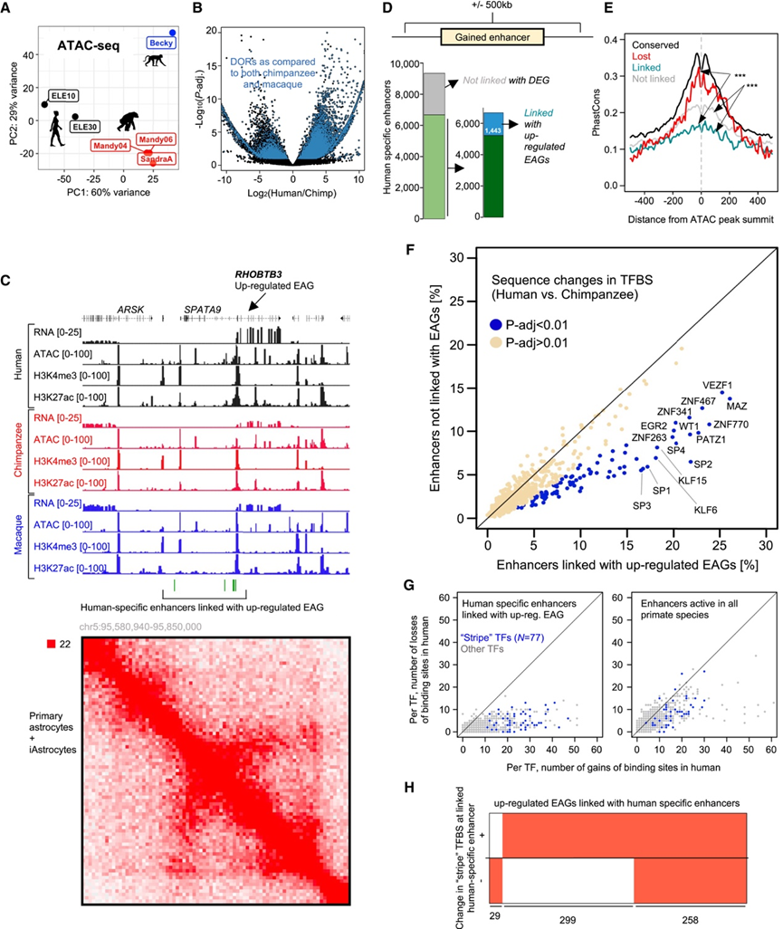 (A) 主成分分析 (PCA) 揭示了人类、黑猩猩和恒河猴 iAstrocyte 染色质开放性图谱按物种的聚类情况。(B) 灵长类动物 iAstrocyte 的差异开放性。(C) 编码上调 EAG RHOBTB3 基因座的基因表达、染色质活性和结构。(D) 人类 iAstrocyte 中获得的大多数增强子可以与进化过程中表达变化的基因相关联。(E) 在常见、缺失和增益的 ATAC 峰顶周围的基因组间隔中的 PhastCons 得分。(F) 在预测的 TF 结合位点 (TFBS) 中发生变化的元件的每个 TF 频率在人类特异性链接和不链接增强子之间有所不同。(G) 连接增强子的 DNA 序列的进化变化导致 TFBS 的增加而不是减少。(H) 大多数上调的 EAG 位于人类谱系中获得的增强子的 500 kb 范围内,该增强子的特点是 (F) 中鉴定的 77 个TF 之一的基序发生了进化变化。
