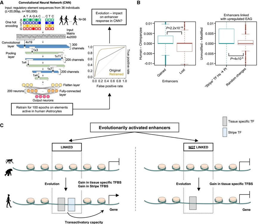(A) 卷积神经网络(CNN)对来自 36 名患者的胶质瘤样本中的 16 万个调控序列进行了训练。(B) 人类 TF 结合的基序赋予所连接增强子的调节元件潜能,高于黑猩猩 TF 识别序列。(C)条纹TF 结合位点的出现有助于增强子的转录激活潜力的进化增益.