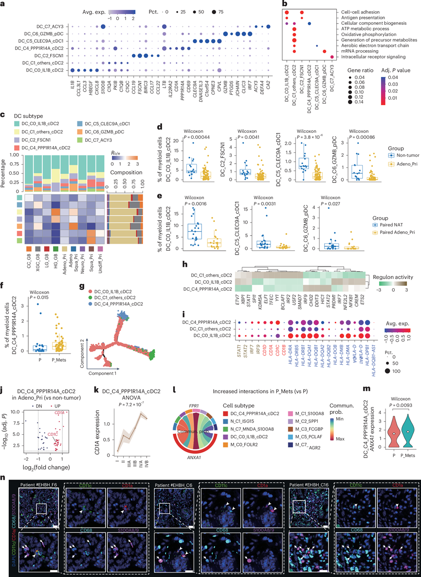 (a-b) DC 亚型的 DEG和富集通路。(c) 热图显示通过R o/e预计的不同疾病患病率。(d-f) DC 亚型的比例。(g) cDC2 亚型的拟时间轨迹。(h) cDC2亚型的转录因子。(i) 不同cDC2亚型中转录因子、CD1和HLA-D的表达。(j) 火山图显示Adeno_Pri与非肿瘤中DC_C4_PPP1R14A_cDC2中的DEG。(k) DC_C4_PPP1R14A_cDC2中CD1A的动态表达及其TNM分期。(l) 弦图显示P_Mets与P之间相互作用增加。(m) DC_C4_PPP1R14A_cDC2中P和P_Mets之间的ANXA1表达。(n) CODEX 成像用于识别患者中由 CD11c 和 CD1a 标记的CD1a +树突状细胞和由 CD68 和 S100A8/9 标记的 S100A8 +巨噬细胞。
