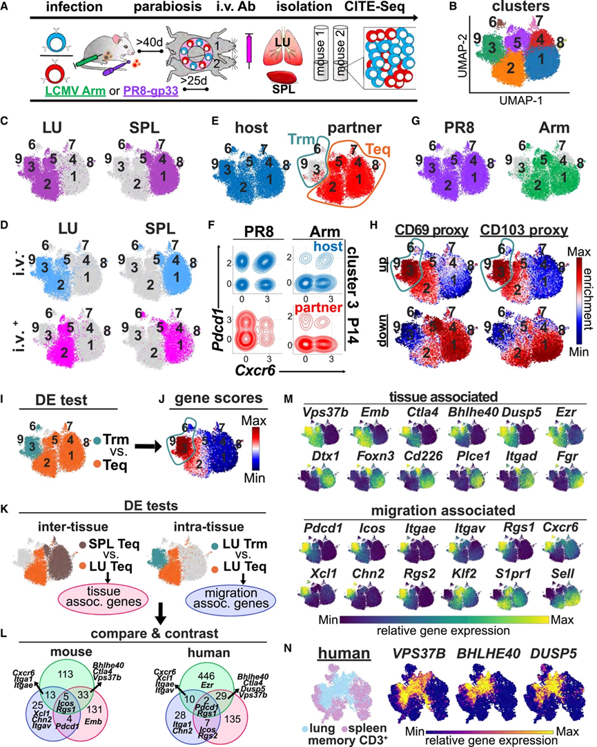 (A) 实验方法。(B-E)UMAP可视化。(F) 肺 Trm 细胞中Pdcd1和Cxcr6基因表达。(G) 每个细胞的感染史过程。(H) 通过比较来自不同组织的不同表型的细胞确定的假定 Trm 细胞中先前确定表达增加(“上调”)或表达减少(“下调”)的基因的富集得分。(I) 通过 scVI DE 测试比较 PR8 产生的 Trm 和 Teq 细胞,以识别 Trm 细胞更丰富表达的基因。(J) 在(I)中鉴定的基因的富集分数。(K) 两次 DE 检验。(L) Trm 基因特征比较。(M) Trm 基因特征进行了比较。(N)组织来源和肺相关基因的相对表达。