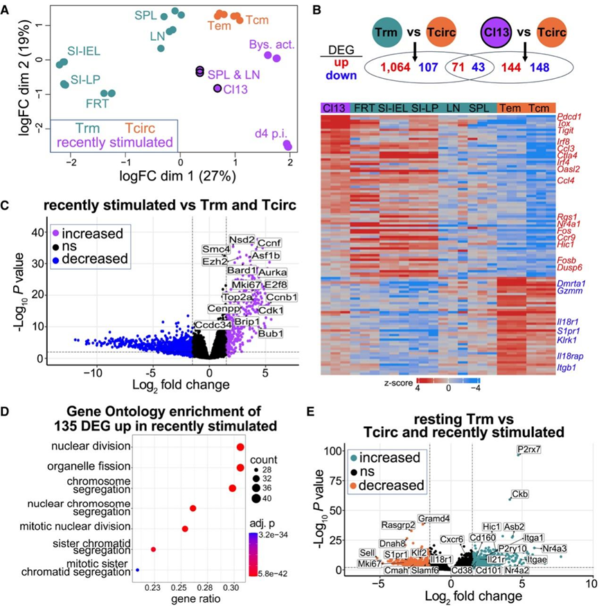 (A) 静息 CD69 + Trm 细胞在转录上是不同的。(B) 差异表达基因 (DEG) 分析。(C) 火山图突出显示了最近受到刺激的群体中表达增加的一些基因。(D) 富集分析的结果。(E) 火山图突出显示了通过将静止 Trm 细胞群体与所有其他细胞群体进行比较而确定的 DEG。