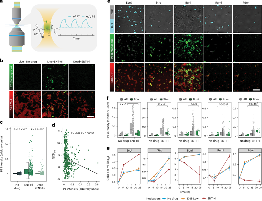 研究表明肠道微生物会对某些药物进行生物累积,从而导致周围环境中的药物耗尽。由于 ENT-Hi 样品在 SRS 泵探测检测期间显示出强烈的非特异性拉曼信号,他们探索了该信号的来源并得出结论,它是光热 (PT) 信号,源自恩他卡朋在微生物细胞内的生物累积。通过对比来自 ENT-Hi 样品和对照的 PT 信号强度(图3a),他们发现恩他卡朋的荧光信号主要出现在与药物共孵育后经洗涤再固定的微生物细胞中,而在先固定后孵育药物(即死细胞)中几乎检测不到该信号(图3b-c)。在同一细胞中测量时,恩他卡朋的积累和细胞活性之间没有很强的相关性,但是恩他卡朋蓄积量高的细胞活性往往较低(图3d)。