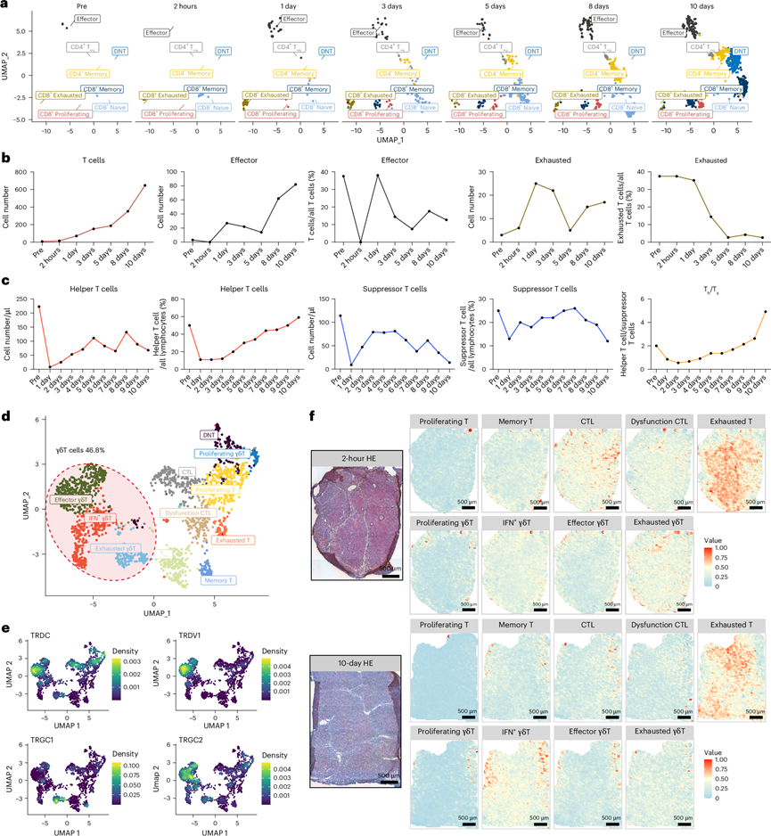 (a) UMAP 图显示了监测期间 PBMC 中 T 细胞亚型的分布。(b) 根据 scRNA-seq 数据确定的监测期间 T 细胞、效应 T 细胞和耗竭 T 细胞的绝对细胞计数和百分比的折线图。(c) 通过外周血样本流式细胞检测的辅助性 T 细胞和抑制性 T 细胞的绝对值和百分比的折线图。(d) UMAP 图显示了已渗入移植猪肝的 T 细胞亚型。(e) T 细胞聚类的 γδT 标志物表达水平的密度图。(f) 左图为移植后 2 小时和 10 天收集的猪肝样本的 HE 染色图像;右图为 CARD 包推断出的 2 小时和 10 天猪肝样本中所示 T 细胞亚型的空间位置。
