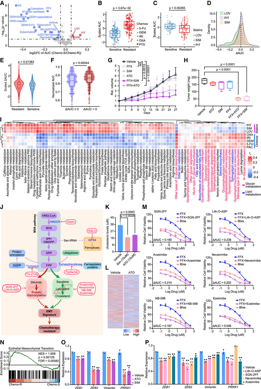 (A) 火山图显示了 chemo-R 和 chemo-S PancO 中抑制剂的分布。(B) 验证集中耐药组和敏感组间 5 种化疗药物的标准化 AUC。(C) 验证集中耐药组和敏感组之间 3 种他汀类药物的标准化 AUC。(D) 验证集中所有组合治疗的 ΔAUC 密度分布。(E) 验证集中耐药组和敏感组之间的缩放 ΔAUC 分布。(F) 验证集中协同和非协同 PancO 的标准化 AUC(化疗药物)分布。(G) 用指示药物治疗后,FFX 抗性的 DAC-71 衍生的皮下异种移植瘤的肿瘤体积。(H) 箱线图显示了使用指示药物治疗后 DAC-71 衍生的原位异种移植瘤的肿瘤重量变化。(I) 热图显示了来自蛋白质组学谱的代谢途径(KEGG 数据库)的 GSVA 富集分数与所示药物的 AUC 值之间的 Spearman 相关性。(J) MVA 和下游通路的示意图。(K) 他汀类药物治疗后 DAC-36 类器官系中细胞内游离胆固醇水平的变化。(L) 热图显示,ATO 处理的类器官系 (DAC-38) 和对照类器官系 (DAC-38) 之间的糖基化位点发生了显著变化。(M) FFX 与糖基化和胆固醇代谢抑制剂在 DAC-36 类器官系中的联合剂量反应曲线。(N) chemo-R 与 chemo-S 中 EMT 通路的 GSEA 富集图。(O-P) EMT 特征基因表达水平的变化。