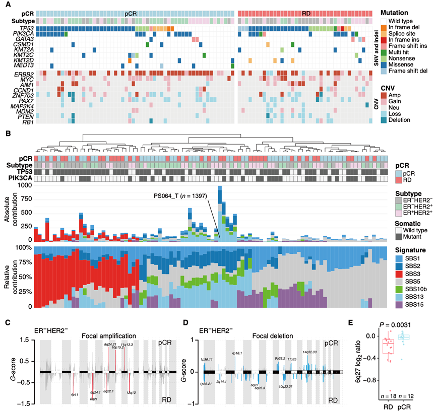 为了探究体细胞突变是否有助于治疗反应,他们比较了 pCR 组和 RD 组中非静默体细胞突变的频率。在校正错误发现率 (FDR) 后,体细胞基因 SNV/INDEL 与 pCR 无显著相关性。对于 CNV,通过比较各亚型中 pCR 组和 RD 组的局部 CNV 分布,他们发现ER− HER2 −患者群体中 RD 组的6q27拷贝数显著较低(图 2C-E)。进一步纳入更多样本或许可以验证这一观察结果,并能够识别更多可预测治疗结果的基因变异。