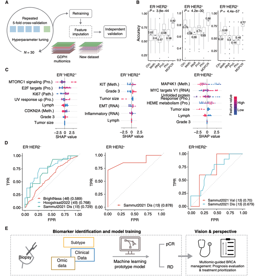 (A) 用于训练和验证机器学习模型的框架。(B) 三种亚型中单组学模型和多组学 pCR 预测模型 (MOPCR) 的交叉验证性能(准确性)比较。(C) 优化的 MOPCR 模型中特征的 SHapley Additive exPlanations (SHAP) 值。(D) 用于在外部数据集中针对每个亚型进行独立验证的接收者操作特征曲线。(E) 本研究中机器学习预测因子的总结。