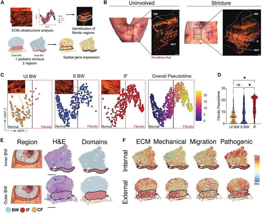 (A) ECM 超微结构分析与 Visium ST 集成的示意图。(B) 图左侧为儿童UI部位的组织大体组织学图像,右侧为经Picrosirius染色处理的代表性切片。(C) 分别绘制 UI BW(左)、狭窄 BW (S BW)(中)和 IF(右)的 ECM 超微结构 UMAP 图(左);以正常 ECM 为原点,使用 Monocle 3 伪时间绘制的 ECM 超微结构整体 UMAP 图(右)。(D) 小提琴图显示每个区域中 ECM 超微结构伪时间图。(E) 示意图,展示了同一患者两处肠段的切片位置(左)、H&E染色(中)和最终区域分类(右)。内肠(肠腔经肠壁至浅层肠纤维层)(上)。外肠(肠壁经肠纤维层至肠囊)(下)。(F) 成纤维细胞特征模块得分的空间特征图。
