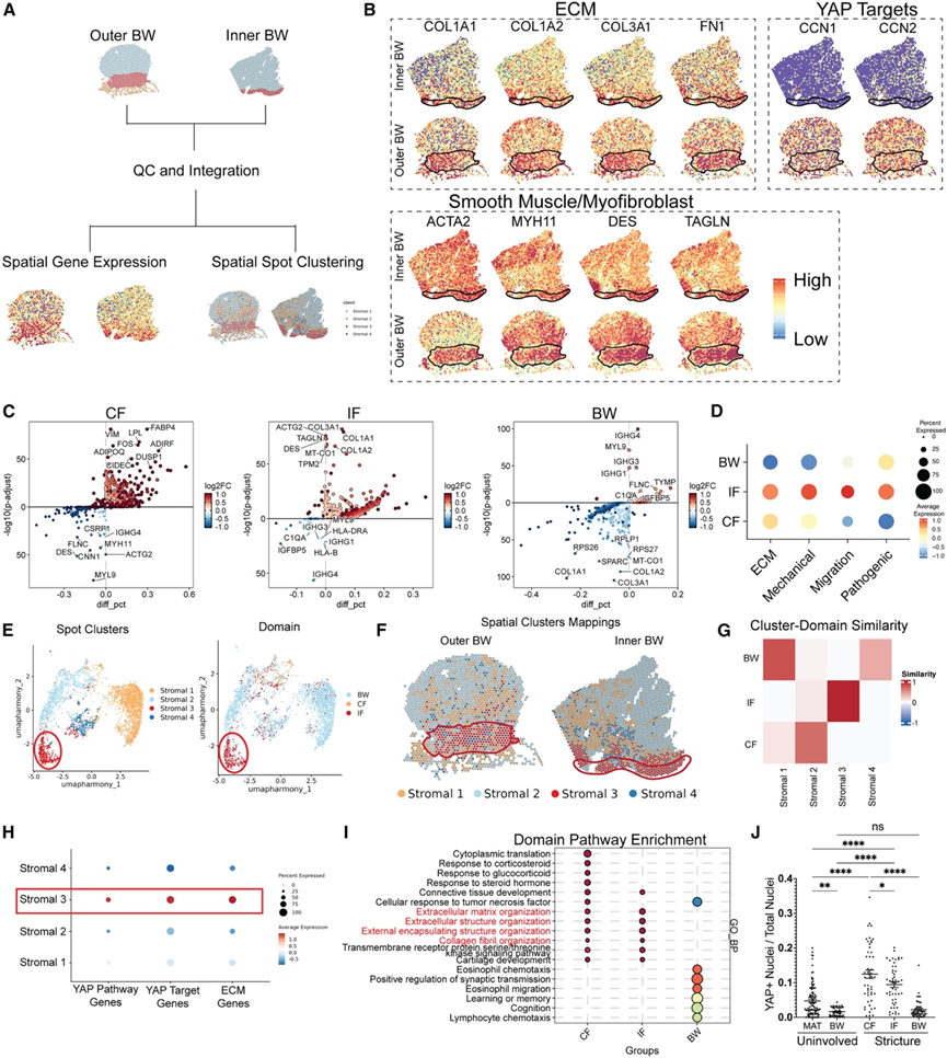 随后,他们对队列中的一例儿童狭窄进行了结构化转录组分析(ST),将狭窄样本解剖为两个区域:内壁(从管腔到浅层间质)和外壁(从下壁至中膜、间质和纤维环)(图2E和图S3A)。与其他区域相比,间质中质的细胞外基质、机械转导、细胞迁移以及致病性成纤维细胞特征和基因显著富集(图2F,图S3B-D)。为了确认间质是一个转录特征独特的区域,他们使用低分辨率对Visium斑点进行了亚聚类。在鉴定出的四个亚群中,基质3斑点独立聚类,与间质斑点重叠,并且在转录水平上与间质斑点相似(图S3E-G)。与其他基质区域相比,基质3也富集了机械敏感基因特征和细胞外基质重塑通路(图S3 H-I)。最后,对核内YAP(一种反映成纤维细胞机械激活的指标)的定量分析表明,CF和IF的核内YAP含量最高,进一步证实CF和IF均为人类狭窄中的机械敏感区域(图S3 J)。