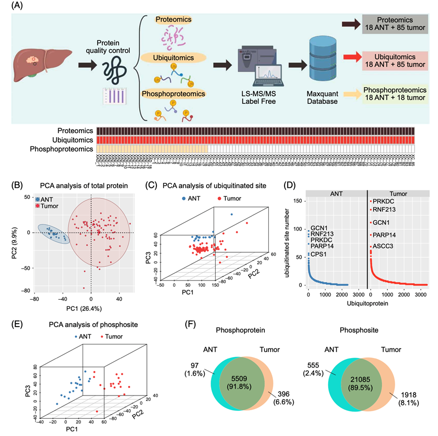 (A) HCC多组学分析示意图。(B) 85例HCC样本和18例ANT中3203个蛋白质的PCA。(C) 85例肝癌样本和18例ANT 中的3099个泛素化位点的PCA分析。(D) 肿瘤和ANT中泛素化蛋白中泛素化位点的分布。(E) 18对配对样本中有4750个磷酸位点。(F) 肝细胞癌患者的磷酸化蛋白质组学概况。