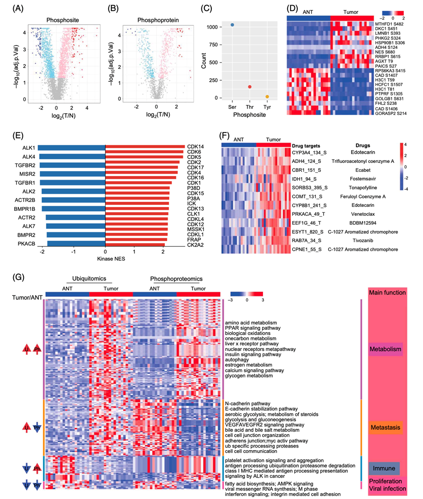 (A-B) 显示肿瘤和ANT中磷酸位点和磷酸化修饰蛋白表达的火山图。(C) 点图显示丝氨酸、苏氨酸和酪氨酸的丰度。(D) 热图显示18对HCC组织中表达最高的10个肿瘤/ANT和ANT/肿瘤的磷酸化位点。(E) 在肿瘤和ANT中通过激酶底物富集分析评价激酶活性。(F) HCC患者的潜在药物靶点。(G) 肿瘤和ANT中的差异表达蛋白和泛素化蛋白及其相关的生物学途径。
