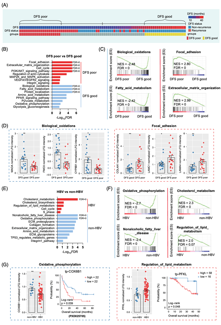 (A) 临床热图显示基于DFS的分组信息。(B-C) 蛋白质组学数据的GSEA揭示了与DFS良好或不良相关的通路。(D) 蛋白组学分析预后良好组和预后不良组之间的蛋白表达差异。(E-F)通路分析。(G)差异表达蛋白分析。