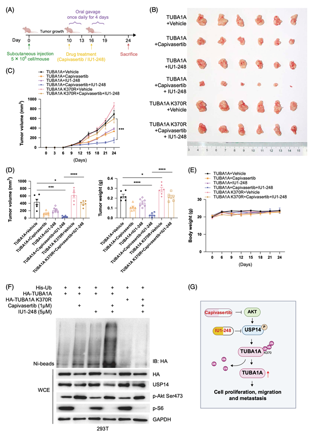 USP14是蛋白激酶B (AKT)的底物,AKT促进USP14-S432磷酸化并增强其稳定性。目前,口服AKT小分子抑制剂capivasertib已批准用于治疗晚期乳腺癌患者,但capivasertib对USP14或TUBA1A高表达的HCC患者的疗效仍未知。因此,他们在HCC细胞系和高表达TUBA1A的小鼠肿瘤中评估了通过AKT抑制剂(capivasertib)和USP14抑制剂(IU1-248)靶向TUBA1A(图7A)。IU1-248显著抑制了USP14在S432的磷酸化,降低了TUBA1A野生型的表达,但未降低其K370突变型的表达,并且AKT抑制剂capivasertib抑制了AKT活化,并进一步增强了这些效应。在HCC- hep3b细胞系中,capivasertib联合IU1-248显著抑制HCC细胞增殖和迁移。在异种移植模型中,与TUBA1A K370R突变组相比,capivasertib联合IU1-248降低了TUBA1A野生型组的肿瘤体积和肿瘤重量(图7B-D)。各组小鼠的体重无显著差异(图7E)。为了进一步验证capivasertib和IU1-248对HCC增殖和迁移的抑制作用是否归因于促进TUBA1A多泛素化和降解,体内泛素化实验表明,capivasertib和IU1-248联合应用显著促进TUBA1A多泛素化,而K370R突变阻断了这一作用(图7F)。为了证实这些抑制剂促进TUBA1A降解,他们分析了capivasertib、IUI-248或两者联合治疗后TUBA1A的半衰期。放线菌酮追赶实验显示,与对照组相比,capivasertib联合IU1-248缩短了TUBA1A野生型的半衰期,而对其K370R突变型的半衰期无影响。总体而言,这些结果提示,抑制AKT和USP14可能通过诱导TUBA1A K370多泛素化和降解来治疗TUBA1A高表达的HCC患者,这为HCC患者提供了一种新的潜在治疗方法(图7G)。