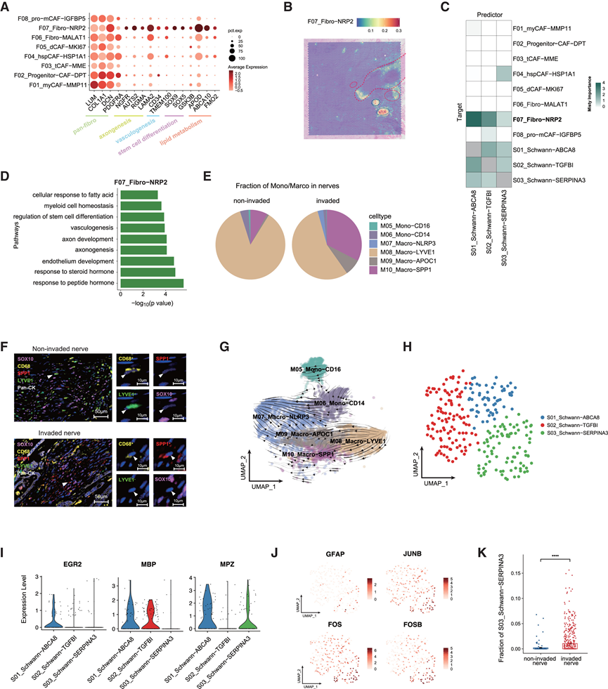 (A) 气泡热图显示F07_Fibro-NRP2的特征基因。(B) F07-Fibro-NRP2 在代表性样本 PA#98 中的定位和比例。(C) 细胞类型丰度在预测5个点半径范围内其他细胞类型丰度时的平均重要性。(D) F07_Fibro−NRP2富集的通路。(E) 未侵入或侵入神经纤维中不同单核细胞和巨噬细胞亚群的部分。(F) mIHC 染色分析。(G) RNA 速度叠加在单核细胞和巨噬细胞的 UMAP 上。(H) UMAP 图显示Schwann细胞亚聚类。(I) 提琴图显示了 3 个Schwann细胞亚聚类中EGR2、MBP和MPZ的表达。(J) UMAP 图显示所有Schwann细胞中 S03_Schwann-SERPINA3 的 4 个代表性特征基因的表达水平。(K) 通过ST分析确定未侵袭和侵袭神经点中S03_Schwann-SERPINA3细胞的比例。