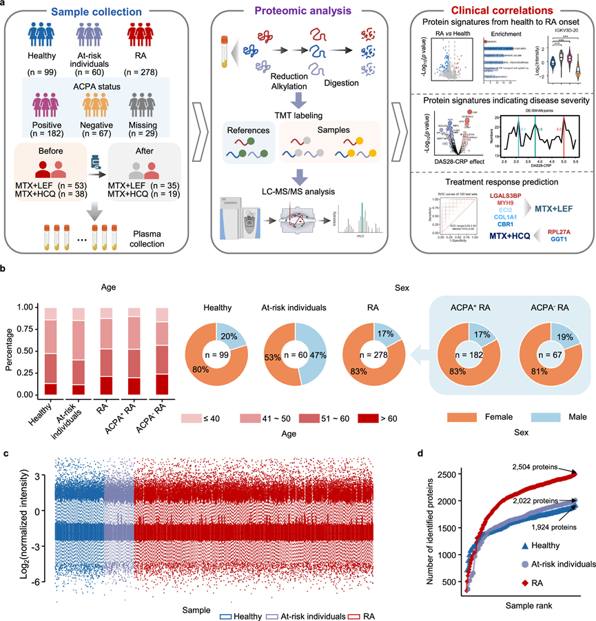 研究团队从中国西部地区招募了 278 名 RA 患者,其中女性 231 名(83%)(图 1a-b)。RA 患者平均年龄为 51 岁,范围为 16 岁至 77 岁。28 个关节的疾病活性评分与 C 反应蛋白(DAS28-CRP)从 1.24 到 8.39 不等,平均值为 3.53。ACPA 阴性个体年龄稍大,平均年龄为 52 岁(ACPA 阳性 RA 患者为51 岁),DAS28-CRP 评分较低,为 3.07(ACPA 阳性 RA 患者为 3.71)。纳入研究的患者在采集血浆样本前至少 6 个月未接受过 传统的合成抗风湿药物 (csDMARD)治疗。在有随访数据的 206 例 RA 患者中,140 例在接受甲氨蝶呤(MTX)单药治疗或 csDMARD 联合治疗后,于 3-6 个月时进行了一次随访,59 例在 6-9 个月时进行了两次随访。此外,他们招募了 60 名风险个体,其中 38 例随访了 5-7 年,以及 99 名健康对照者进行比较分析。健康对照者平均年龄为 51 岁,范围为 38-76 岁(79 名女性和 20 名男性)。60 名风险个体的平均年龄为 48 岁(32 名女性和 28 名男性),范围为 29 至 74 岁。