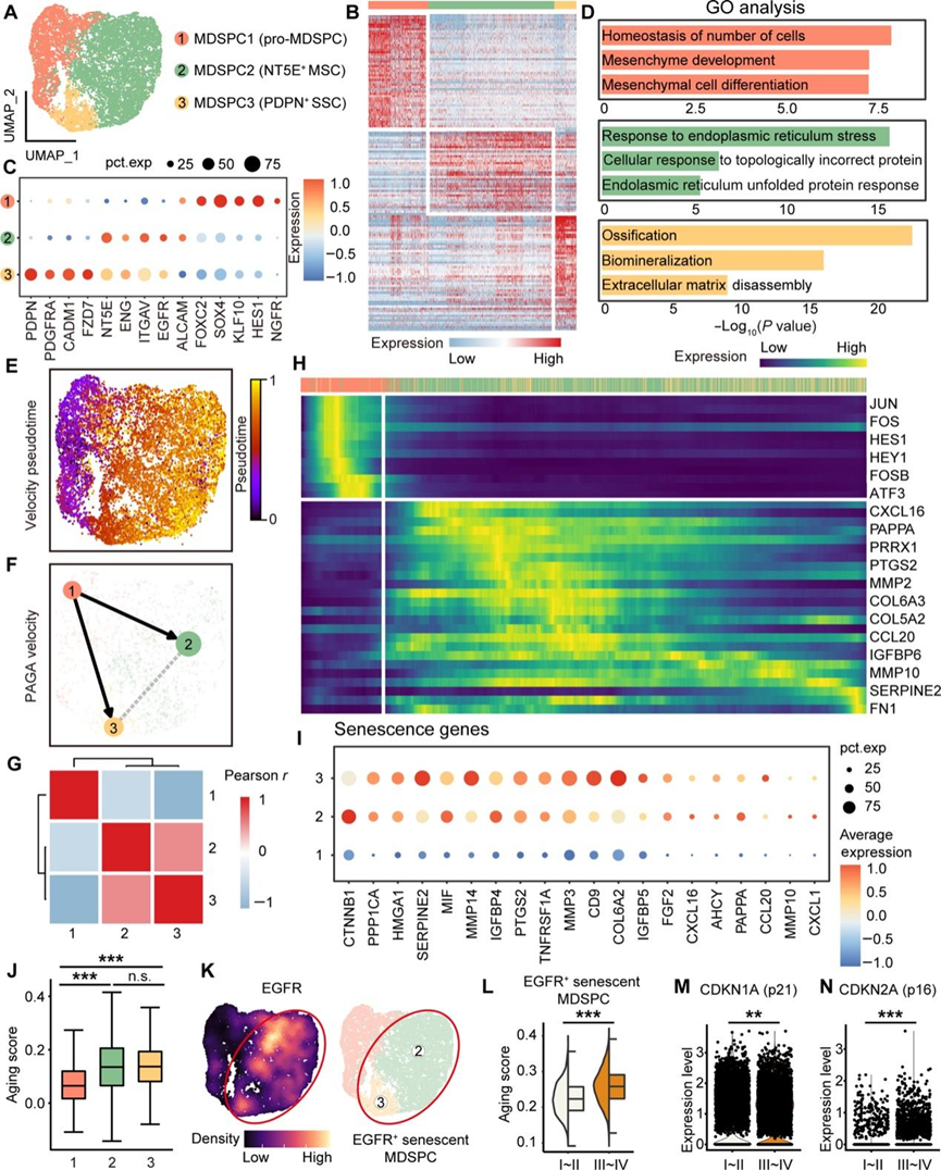 (A) UMAP可视化。(B) 热图显示每个 MDSPC 亚聚类中的差异基因表达。(C) 点图显示 MDSPC 每个亚聚类中标记基因的表达。(D) GO分析。(E) UMAP 上 RNA 速度映射的伪时间分析。(F) 基于分区的图形抽象 (PAGA) 分析显示 MDSPC 亚聚类之间的连通性。(G) MDSPC 亚聚类之间的相关性分析。(H) 热图显示伪时间轨迹上的差异基因表达。(I) 点图显示每个 MDSPC 子聚类中衰老基因的表达情况。(J) 箱线图显示每个 MDSPC 亚聚类的衰老评分。(K) 密度图显示EGFR基因的表达,UMAP 显示EGFR表达细胞。(L) 小提琴箱线图显示 EGFR +衰老 MDSPC 中 I~II 侧和 III~IV 侧组织之间的衰老评分。(M-N) CDKN1A和CDKN2A的表达分析。