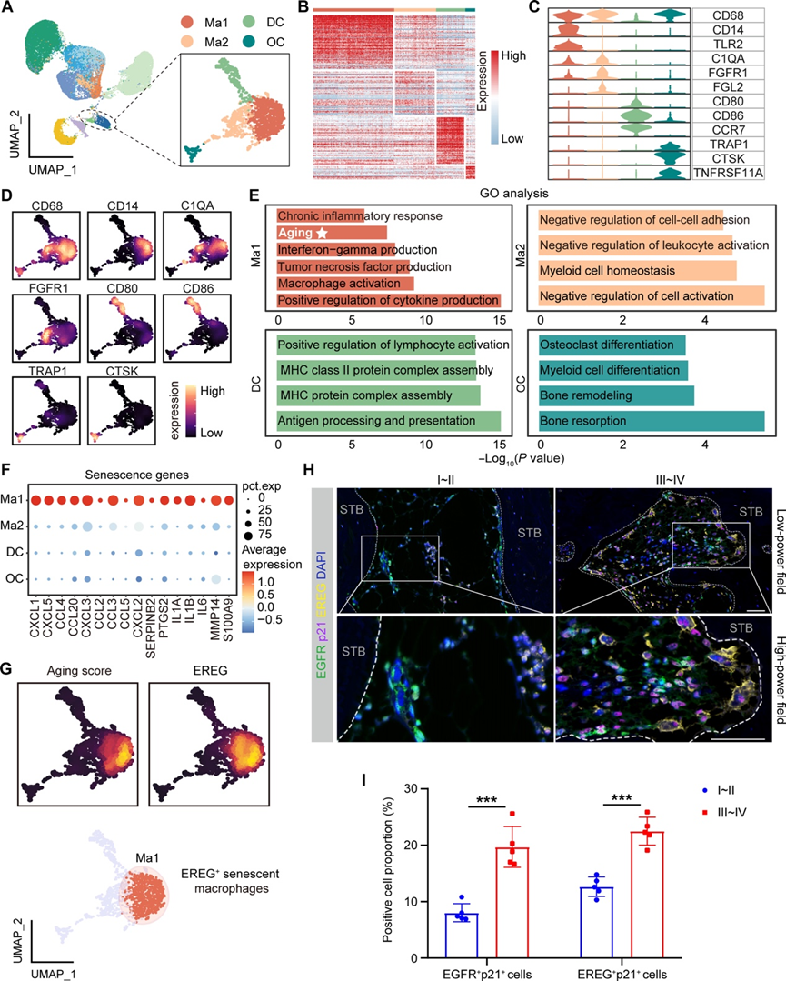 鉴于单核细胞/巨噬细胞衍生的 EREG 在调节 EGFR+衰老 MDSPC中的特殊作用,他们进一步剖析了单核细胞/巨噬细胞亚群的细胞异质性。单核细胞/巨噬细胞聚类重新分组为四个不同的亚聚类:巨噬细胞 1 (Ma1)、巨噬细胞 2 (Ma2)、树突状细胞 (DC) 和 OC(图 6A),每个聚类的 DEG 用于功能注释(图 6B)。Ma1 的特征是表达CD68、CD14和TLR2;Ma2 表达C1QA、FGFR1和FGL2;树突状细胞表达CD86、CD80和CCR7;而 OC 表达TRAP1、CTSK和TNFRSF11A(图 6C-D)。 DEGs 的 GO 分析表明,Ma1 参与慢性炎症反应并促进炎症细胞因子的产生,例如干扰素-γ和肿瘤坏死因子;Ma2 主要通过抑制白细胞活化和维持髓系细胞稳态在抗炎过程中发挥作用;DC 表现出强大的主要组织相容性复合物 II 类活性和抗原呈递能力;而 OC 参与骨吸收(图 6E)。值得注意的是,Ma1 表现出与衰老相关的生物学特征,并特异性表达与衰老相关的基因(图 6E-F)。衰老评分分析显示高衰老评分区域与 Ma1 聚类重叠,后者也特异性表达EREG(图 6G)。因此,他们将 Ma1 巨噬细胞定义为 EREG +衰老巨噬细胞。EREG+巨噬细胞的衰老特征在 I~II 侧和 III~IV 侧有所不同,其中 III~IV 侧表现出经典衰老基因CDKN1A (p21) 的表达明显较高,但是CDKN2A (p16) 的表达没有显著差异。