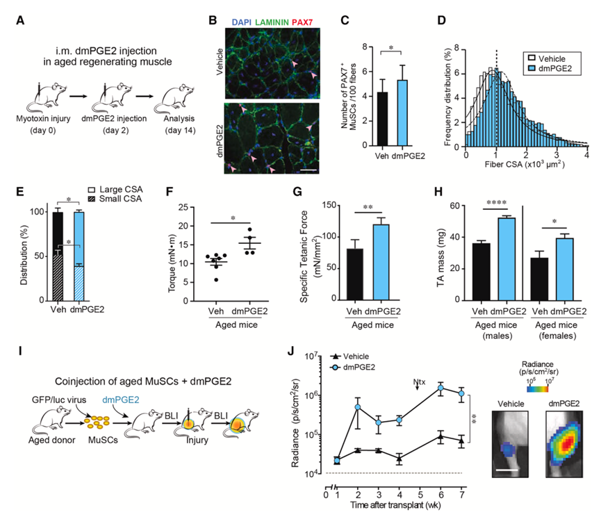 (A) 实验方案。(B) 代表性免疫荧光染色。(C) 每 100 根纤维中的 PAX7+ MuSC。(D) 载体和 dmPGE2 治疗的 TA 中的肌纤维横截面积 (CSA)。(E) 小 (<1000 μm2) 和大 (>1000 μm2) 肌纤维的分布。(F) 强直收缩力。(G) 肌肉强度。TA 肌肉质量。(I) 移植方案。(J) 移植后的 BLI 信号表示为平均辐射度,每种条件下的代表性 BLI 图像(右)。