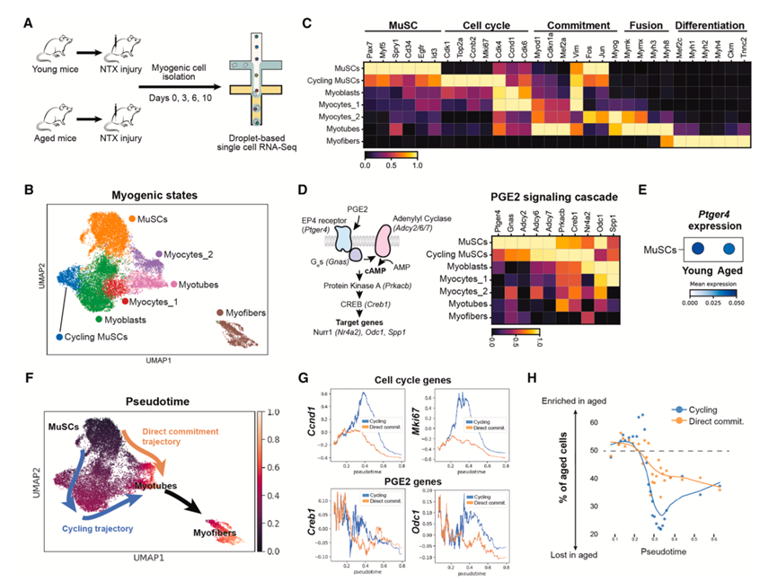 为了探究衰老 MuSC 在再生过程中的功能障碍反应以及 PGE2 信号是否发挥作用,他们对肌肉损伤后的年轻和老年 MuSC 进行了单细胞转录组分析(scRNA-seq)。在 NTX 诱导的损伤后 3、6 和 10 天,从未受伤的年轻成年小鼠(8 周)和老年小鼠(>18 个月)中分离 MuSC 和成肌祖细胞(图 4 A)。根据成肌状态(MuSC、细胞周期、定型、融合和分化)的标志基因和成肌调节因子(MRF:Myod1、Myog、Myf5和Myf6)的表达,对成肌细胞进行聚类和注释(图 4 B-C)。
