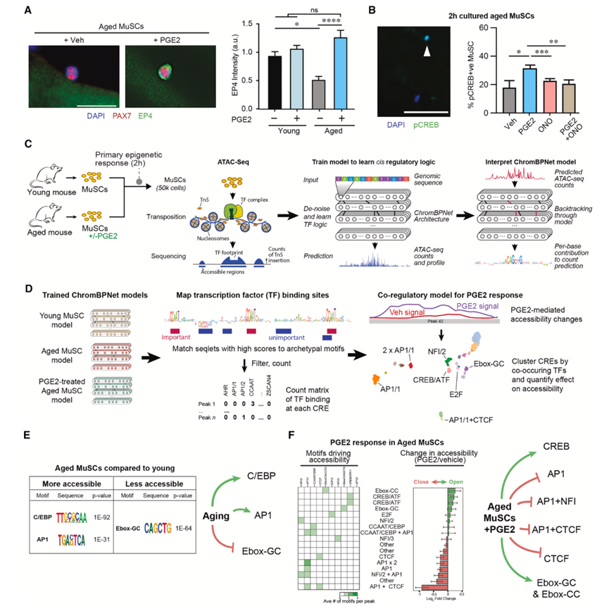 本研究发现衰老的 MuSC 会减弱PGE2-EP4 受体信号传导,从而导致早熟定型和有丝分裂灾难。PGE2 治疗可改变染色质的可及性,并克服衰老 MuSC 功能失调的命运轨迹,提高细胞活力并触发细胞周期重新进入。本研究利用神经网络模型来学习驱动可及性变化的转录因子的复杂逻辑。经 PGE2 治疗后,检测到转录因子在 CRE 和 E-box 基序位点的结合增加,而在 AP1 基序位点的结合减少,从而克服了随年龄增长而发生的变化。短期暴露于 PGE2 可增强衰老 MuSC 移植后的长期再生能力。令人惊讶的是,在肌毒素或运动引起的损伤后注射 PGE2 可以克服衰老的生态位,从而增强内源性组织驻留 MuSC 的再生功能并增加强度。