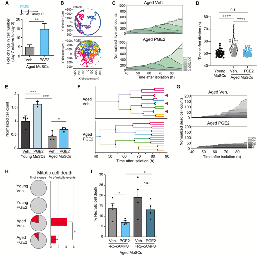 (A) 对老年小鼠(18-20 个月)中的 MuSC 数量进行定量。(B) 通过延时显微镜观察在水凝胶微孔中用载体(上)或 PGE2(下)处理的衰老(18-20 个月)MuSC 克隆的代表性轨迹。(C) 通过延时显微镜跟踪衰老 MuSC(18-20 个月)克隆中的活细胞计数。(D) 根据 (C) 中追踪的老年克隆计算出的首次细胞分裂时间,并与从年轻小鼠(2 个月)中分离的 MuSC 克隆进行比较。(E) 培养 7 天后,用载体或 dmPGE2处理的年轻和老年 MuSC 的定量。(F) 来自载体或PGE2处理条件下的单个代表性克隆的谱系追踪。(G) 来自载体或PGE2处理条件下的单个代表性克隆的谱系追踪。(H) 分裂后 2 小时内导致细胞死亡事件的克隆和有丝分裂事件的比例。(I)流式细胞分析。