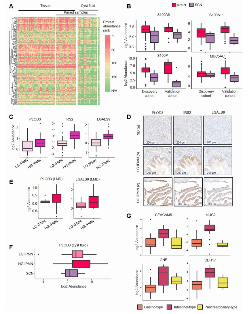 (A) 与ND相比,IPMN中表达上调的蛋白有144种,且在囊液中也可检测到。(B) 囊液的发现队列(64个IPMN和3个SCN)和验证队列(13个IPMN和10个SCN)之间蛋白质表达谱分析。(C) 上调的蛋白分析。(D) 免疫组化染色分析。(E) PLOD3和LGALS9的LMD结果。(F) PLOD3的蛋白表达分析。(G) 与肠型和胰胆管型IPMN相比,胃型IPMN中高表达的蛋白。
