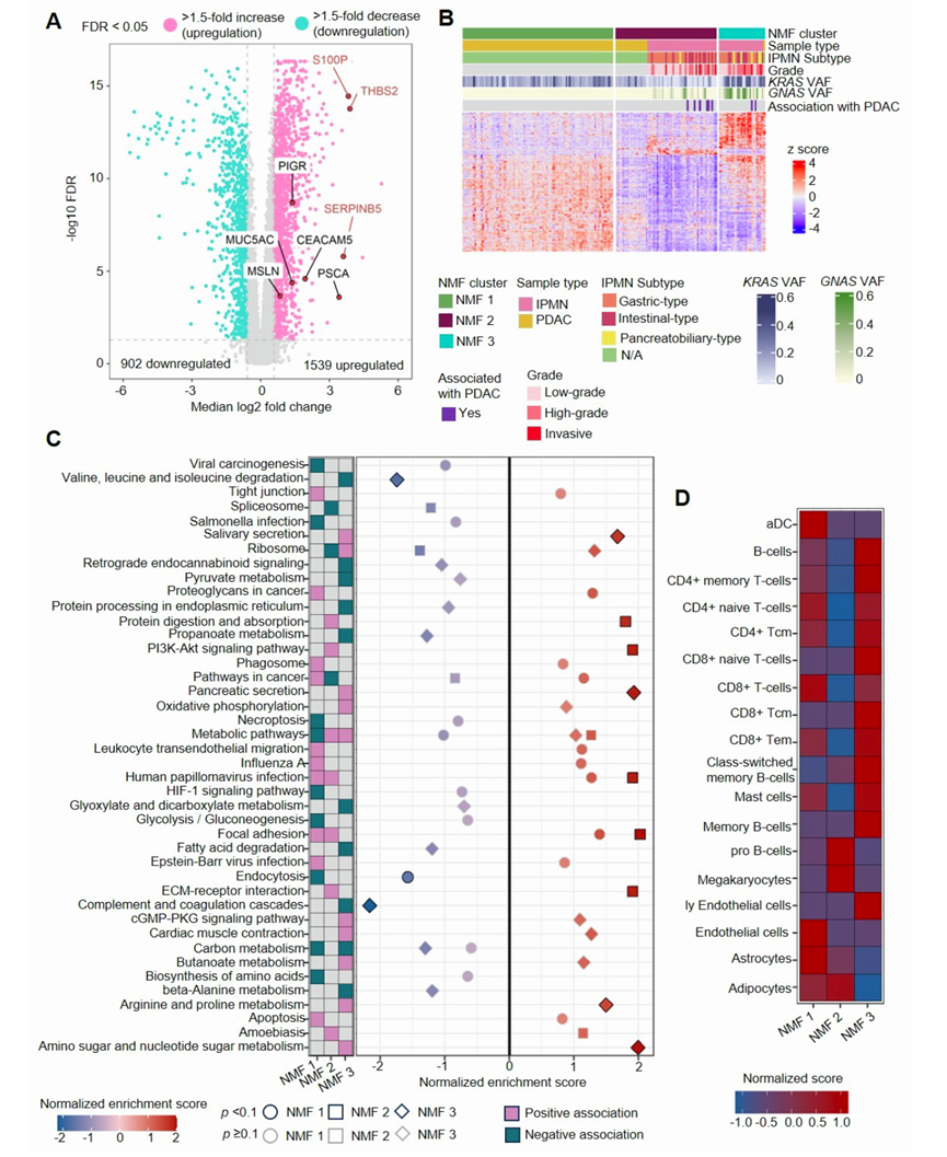 与 76 个 ND 相比,64 个 IPMN 中的 756 种蛋白质显著上调超过 1.5 倍,438 种蛋白质下调超过 1.5 倍(图 2A)。正如 IPMN 名称中包含“粘液”所暗示的那样,聚糖和多糖在这些肿瘤中显著上调。携带KRAS或GNAS热点突变的 IPMN表现出特别升高的糖基化和糖蛋白加工蛋白。KEGG通路富集分析显示,IPMN 蛋白质组在聚糖生物合成和代谢途径中显著富集,特别是粘蛋白型 O-聚糖生物合成(图2B)。确定了与宿主防御相关的免疫途径,其中免疫系统识别并消除抗体标记的病原体。
