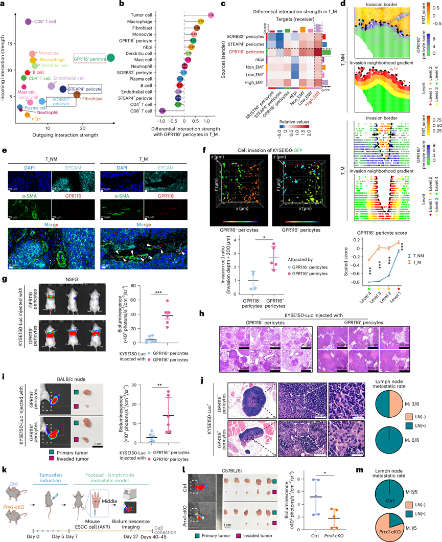 (a) 使用 CellChat 工具计算肿瘤微环境 (TME) 中每种细胞类型的细胞间相互作用强度。(b) Lollipop图显示,在转移性癌症患者中,肿瘤细胞与 GPR116+周细胞的相互作用增强最为显著。(c) 热图显示,在转移性癌症患者中,高 EMT 潜能的肿瘤细胞与 GPR116+周细胞的相互作用增强最为显著。(d) 在有或无转移的患者中,肿瘤侵袭边缘附近GPR116 +周细胞评分的逐渐变化趋势。(e) 多重免疫荧光染色代表性图像。(f) 3D凝胶侵袭实验。(g) 肺转移的生物发光成像和定量分析。(h) H&E染色。(i) 生物发光成像和定量分析。(j) 代表性H&E染色及比较。(k) Prrx1条件性敲除(cKO)小鼠足垫注射和淋巴结转移模型的构建示意图。(l) 生物发光成像和定量分析。(m) 对照组(Ctrl)和Prrx1 cKO小鼠腘窝引流淋巴结转移率的饼图。