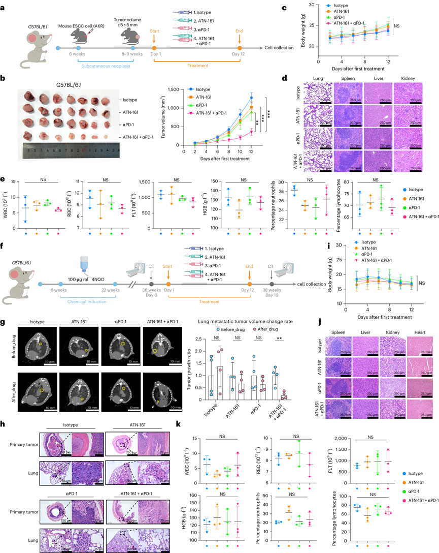 为了模拟伴有转移的晚期ESCC,他们通过给予4-硝基喹啉-1-氧化物(4NQO)建立了自发性肿瘤小鼠模型(图7f)。在36周时,当使用微型CT检测到肺转移时,开始进行治疗。肺肿瘤大小测量和苏木精-伊红(H&E)染色结果显示(图7g-h),与单药治疗相比,ATN-161和αPD-1联合治疗显著抑制了原发肿瘤的进展和远处转移,且未观察到不良反应(图7i-k)。这些临床前结果表明,ATN-161和αPD-1联合治疗具有治疗晚期ESCC的潜力。
