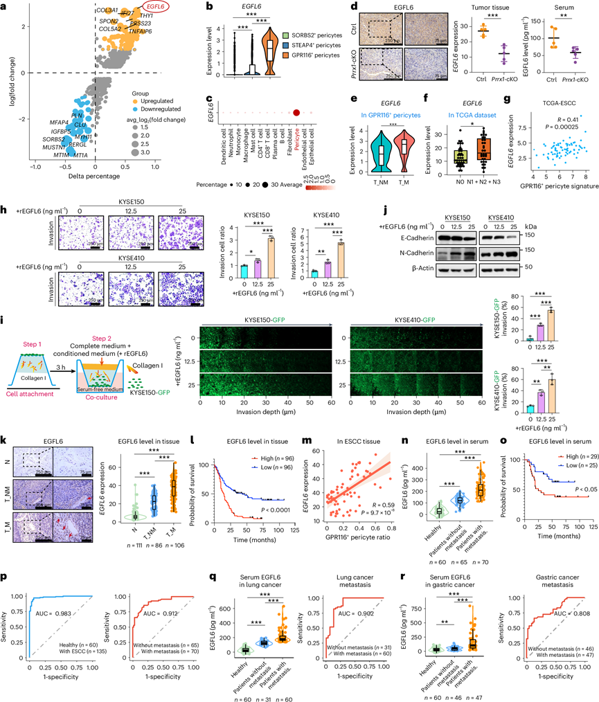 (a) 基因表达差异分析。(b) 三种周细胞亚群中EGFL6表达的统计学检验。(c) ESCC中不同细胞类型EGFL6表达及其百分比的散点图。(d) 采用免疫组织化学(IHC)和酶联免疫吸附试验(ELISA)定量分析。(e-g) EGFL6表达分析。 (h) 代表性图像和定量分析显示EGFL6对KYSE150和KYSE410侵袭的影响。(i) 左:反向侵袭模型示意图。中:激光诱导荧光成像。右:定量分析显示EGFL6对KYSE150-GFP和KYSE410-GFP侵袭的影响。(j) 免疫印迹分析。(k) 不同组织中EGFL6的免疫组化染色和定量分析。(l) 分层生存分析。(m) ESCC组织中EGFL6表达与GPR116+周细胞比例的相关性。(n) 血清EGFL6水平的统计学检验。(o) 根据血清EGFL6水平对ESCC患者进行分层生存分析。(p) 血清EGFL6水平预测ESCC发生的受试者工作特征(ROC)曲线。(q-r) 左图:健康个体以及有/无转移癌症患者血清EGFL6水平的统计检验。右图:血清EGFL6水平预测转移的ROC曲线。