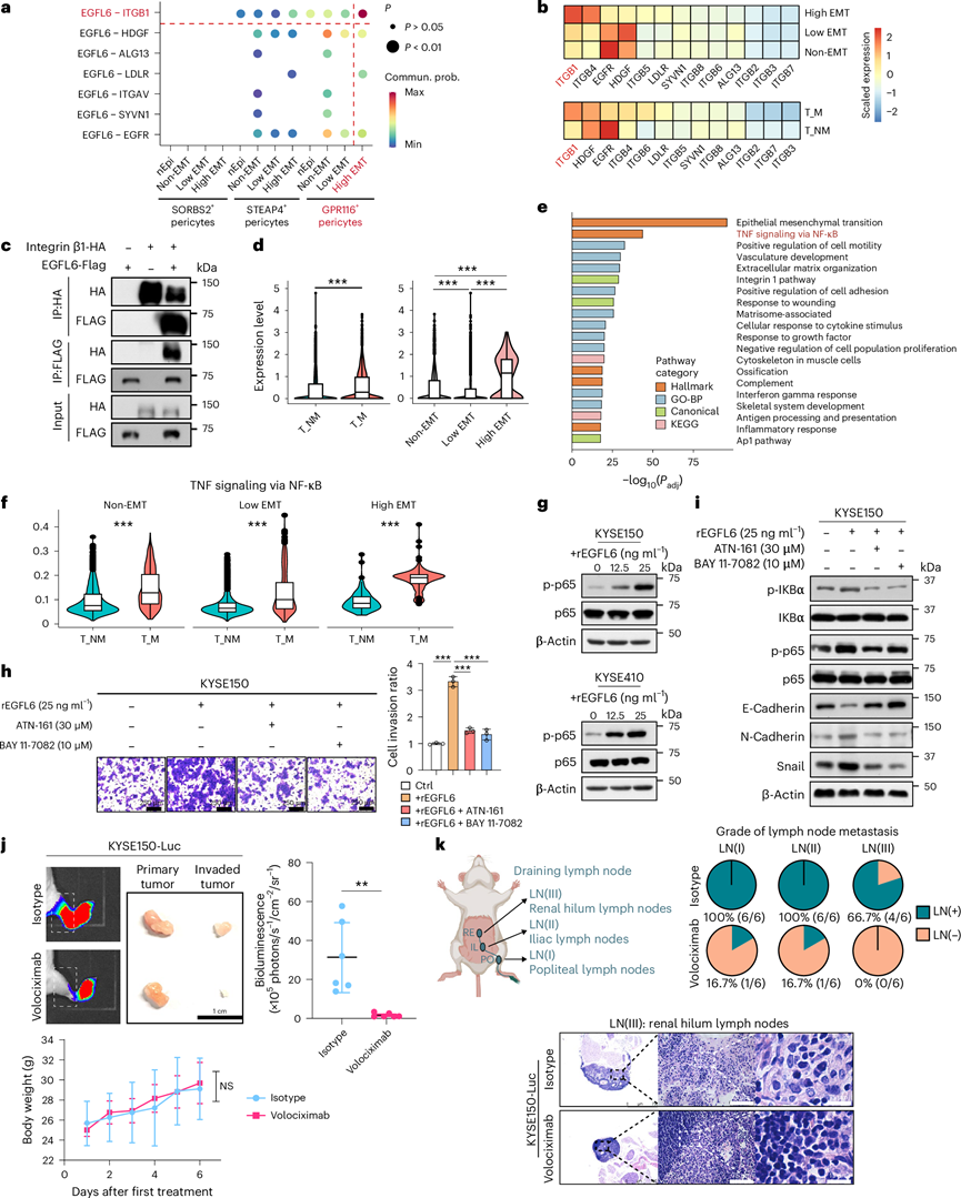 (a) EGFL6及其受体在三种周细胞亚群中具有不同EMT能力的肿瘤细胞上的细胞间相互作用。(b) 热图显示各组肿瘤细胞上EGFL6受体的表达情况。(c) 免疫沉淀实验显示EGFL6与整合素β1之间的相互作用。(d) 比较有转移和无转移ESCC患者的肿瘤细胞以及具有不同EMT能力的肿瘤细胞上ITGB1的表达。(e) 通路富集分析。(f) 基因集富集分析显示。(g) 免疫印迹分析。(h) 代表性图像和定量分析显示。(i) 免疫印迹分析。(j) 生物发光成像和定量分析显示。(k) 肿瘤浸润比例比较。