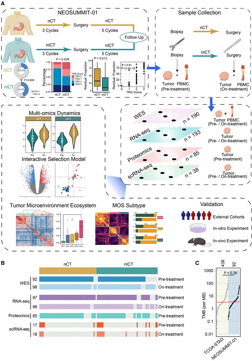 (A) 研究框架示意图。(B) 热图展示了四种组学方法的样本数量。(C) 比较NEOSUMMIT-01 队列(n = 92)和 TCGA-STAD 队列(n = 438)的肿瘤突变负荷(TMB)。