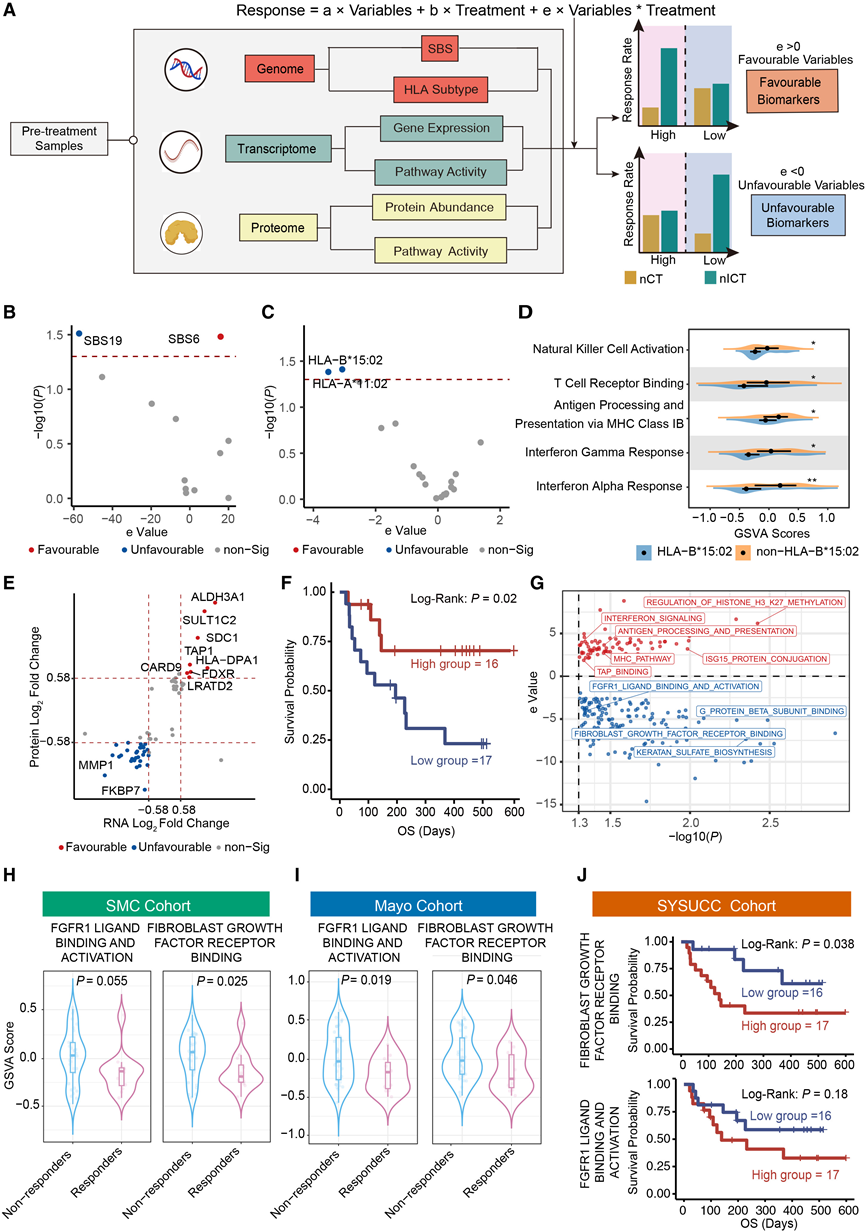 (A) 筛选疗效生物标志物以预测免疫化疗与化疗组相比的临床获益的工作流程。(B-C) 火山图分别展示了有利和不利的 SBS 特征和 HLA 亚型。(D) NEOSUMMIT-01研究中HLA-B * 15:02 阳性患者和非 HLA-B * 15:02 阳性患者的免疫应答相关通路活性。(E) 点图显示转录组和蛋白质组学数据。(F) 中山大学肿瘤中心队列中 FDXR 的 Kaplan-Meier 生存曲线。(G) 火山图显示了交互项的p < 0.05。(H-I) 来自两个胃癌单药免疫治疗队列的应答者和非应答者样本中的通路活性。(J) 中山大学肿瘤中心队列中两种FGFR通路Kaplan-Meier生存曲线。
