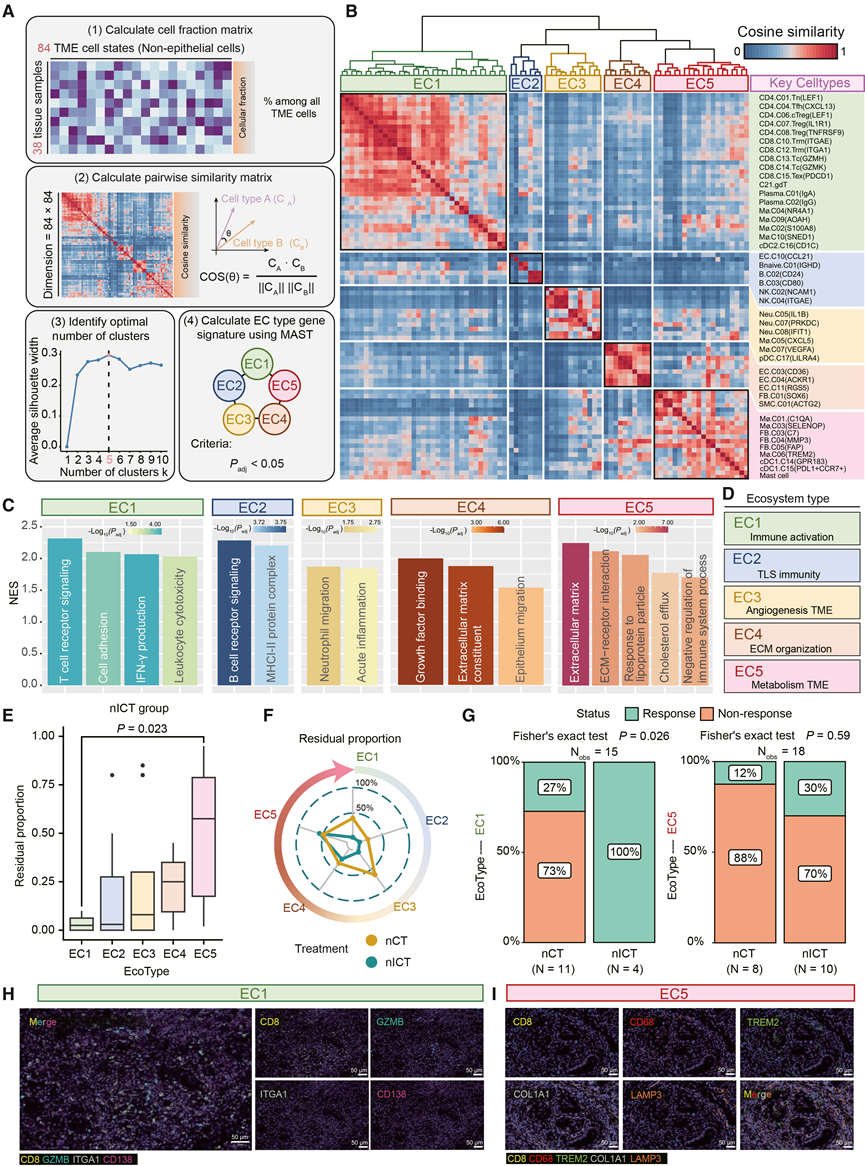 (A) 构建生态型的策略。(B) 基于成对相似性推断出的五种生态型。(C) 不同生态型中富集的关键通路。(D) 各生态型的定义。(E) 箱线图显示了nICT组中各生态型残余肿瘤比例。(F) 雷达图显示免疫化疗或化疗后每种生态型的中位残余肿瘤比例。(G) 柱状图显示EC1和 EC5亚型中有效/无效患者的百分比。(H) 对代表性 EC1 样本进行 mIHC 染色,检测以下标记物:CD8、GZMB、ITGA1、CD138 和 DAPI。(I) 对代表性 EC5 样本进行 mIHC 染色,检测以下标记物:CD8、CD68、TREM2、COL1A1、LAMP3 和 DAPI。