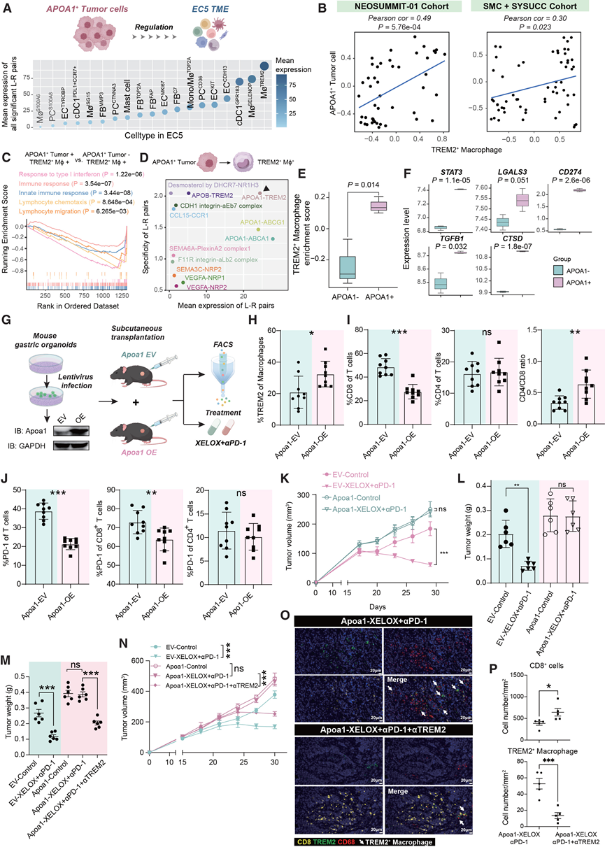 (A) 从 APOA1+肿瘤细胞到 EC5 细胞状态的显著配体-受体对的平均表达。(B) 散点图显示了NEOSUMMIT-01 队列和SMC队列+SYSUCC 队列中APOA1+肿瘤细胞与TREM2+巨噬细胞之间的Pearson 相关系数和p值。(C) 对含有和不含APOA1+肿瘤细胞的样本中的TREM2 +巨噬细胞进行基因集富集分析。(D) APOA1+肿瘤细胞与 TREM2+巨噬细胞之间的相互作用轴。(E) 用APOA1蛋白刺激后TREM2+巨噬细胞的富集评分。(F) APOA1蛋白刺激后免疫抑制分子的表达水平。(G) 实验设计示意图。(H-J) poa1 过表达对mGCO 皮下肿瘤模型。(K) 将由 mGCO-EVs 或 mGCO-Apoa1 形成的皮下肿瘤分别用对照组或 XELOX + αPD-1 处理。(L-M) 列出了终点肿瘤重量。(N) 分别用对照组或XELOX+αPD-1处理由mGCO-EVs或mGCO-Apoa1形成的皮下肿瘤。(O) 代表性皮下肿瘤样本中以下标记物的mIHC染色:CD8、TREM2和CD68。(P) 多重免疫组化 (mIHC)分析。