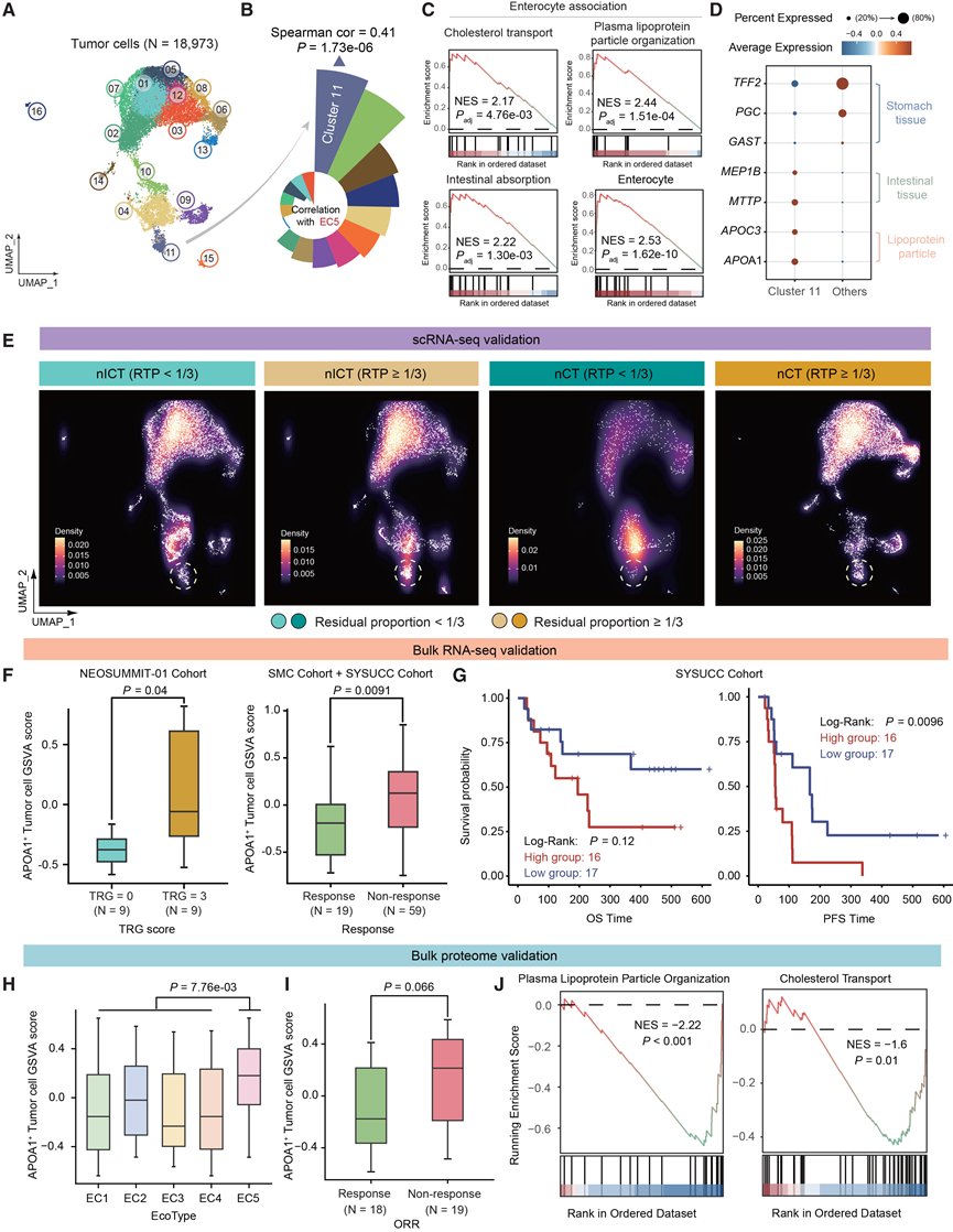 (A) UMAP可视化18973个肿瘤细胞,识别出16个细胞聚类。(B) EC5 特征评分与肿瘤细胞聚类之间的 Spearman 相关性。(C) 基因集富集分析(GSEA)显示聚类11肿瘤细胞中富集的通路。(D) 点图显示了在聚类11中特异性表达的基因。(E) UMAP可视化显示不同治疗方案和治疗效果下的细胞密度分布。(F) 箱线图显示了使用来自 NEOSUMMIT-01 队列和 SMC 队列+SYSUCC 队列的RNA-seq数据。(G) Kaplan-Meier生存分析。(H) 箱线图显示了使用来自 NEOSUMMIT-01 队列中数据。(I) 箱线图显示应答者和非应答者之间APOA1+肿瘤细胞的富集情况。(J) GSEA 分析显示,在免疫化疗有效/无效的患者中,有以下通路表达下调。